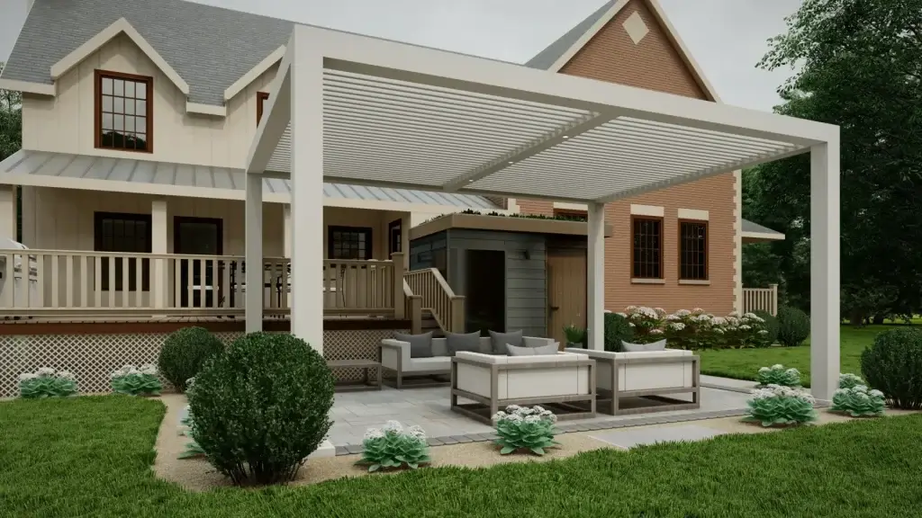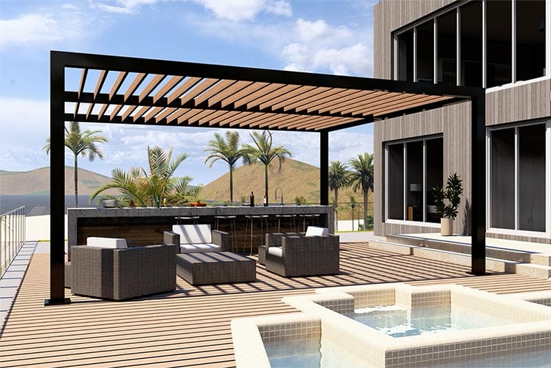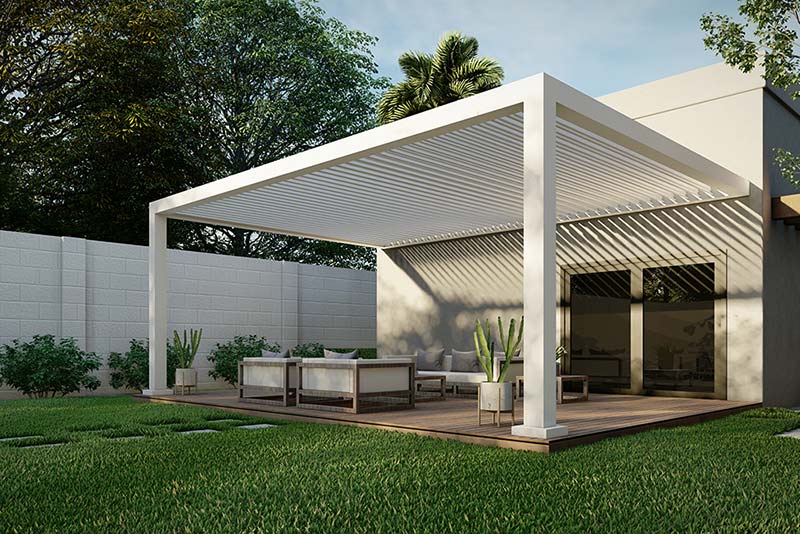 Transform your backyard or commercial area into a stylish exterior with the R-BREEZE™ pergola with fixed louvers. The R-BREEZE™ modern architectural element combines elegance with durability and offers an ideal outdoor living solution.