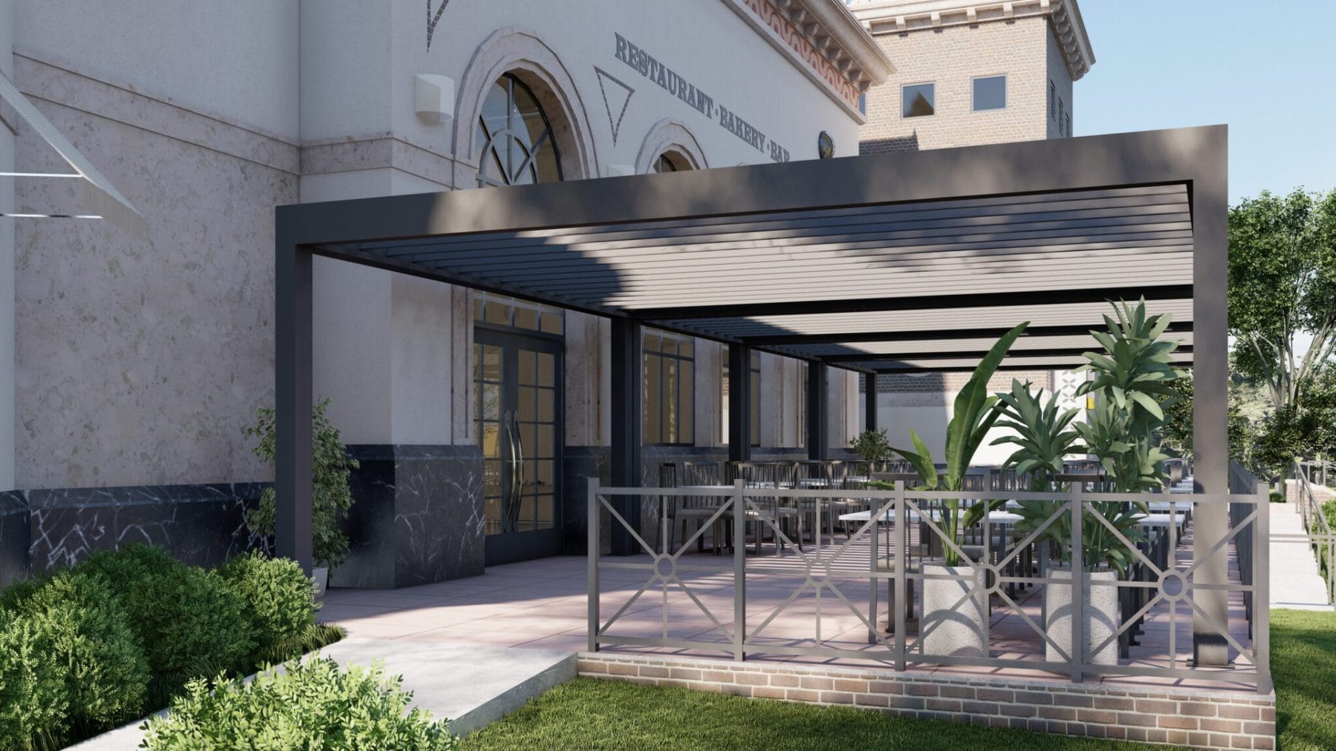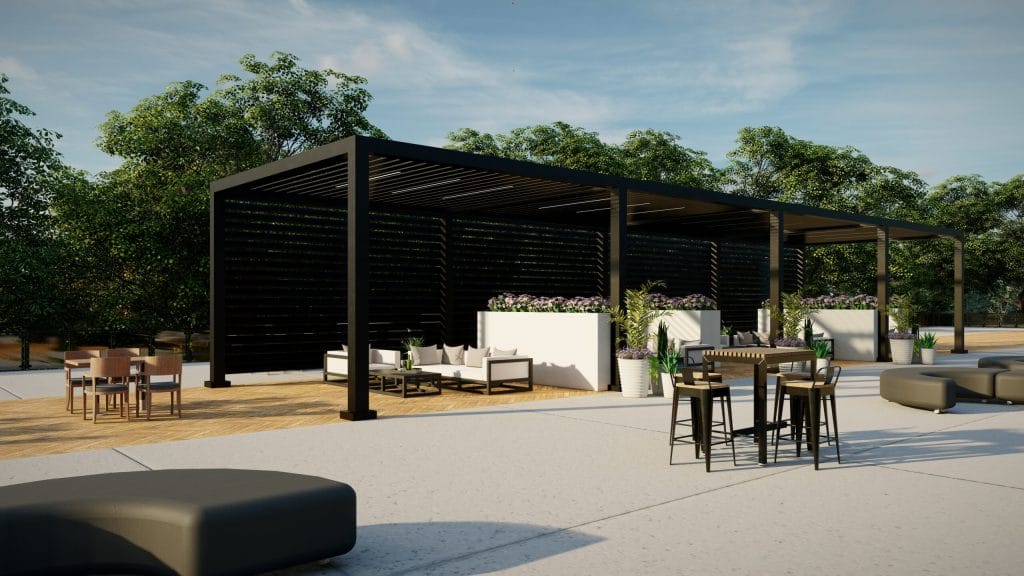 The R-BREEZE™ Pergola features fixed louvers angled at 55° or set vertically at 90°, providing the perfect blend of sun and shade. Our team can design and install a pergola tailored to your commercial needs, blending seamlessly with any architectural style.