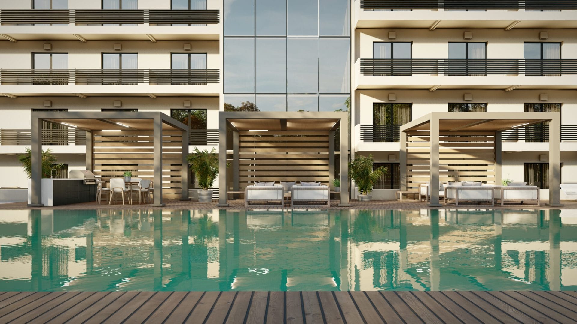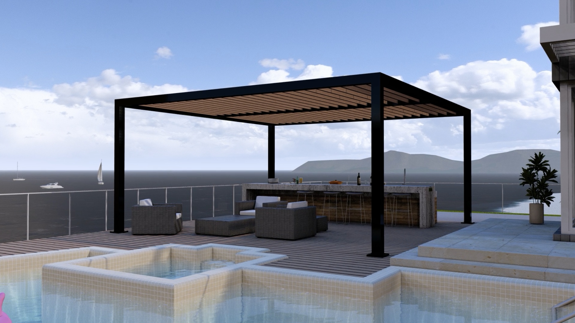 Transform your backyard or commercial area into a stylish exterior with the R-BREEZE™ pergola with fixed louvers. The R-BREEZE™ modern architectural element combines elegance with durability and offers an ideal outdoor living solution.